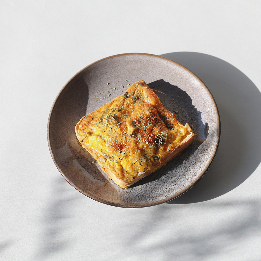 Toasted bread topped with a combination of turkey, eggs, mushroom and cheese.