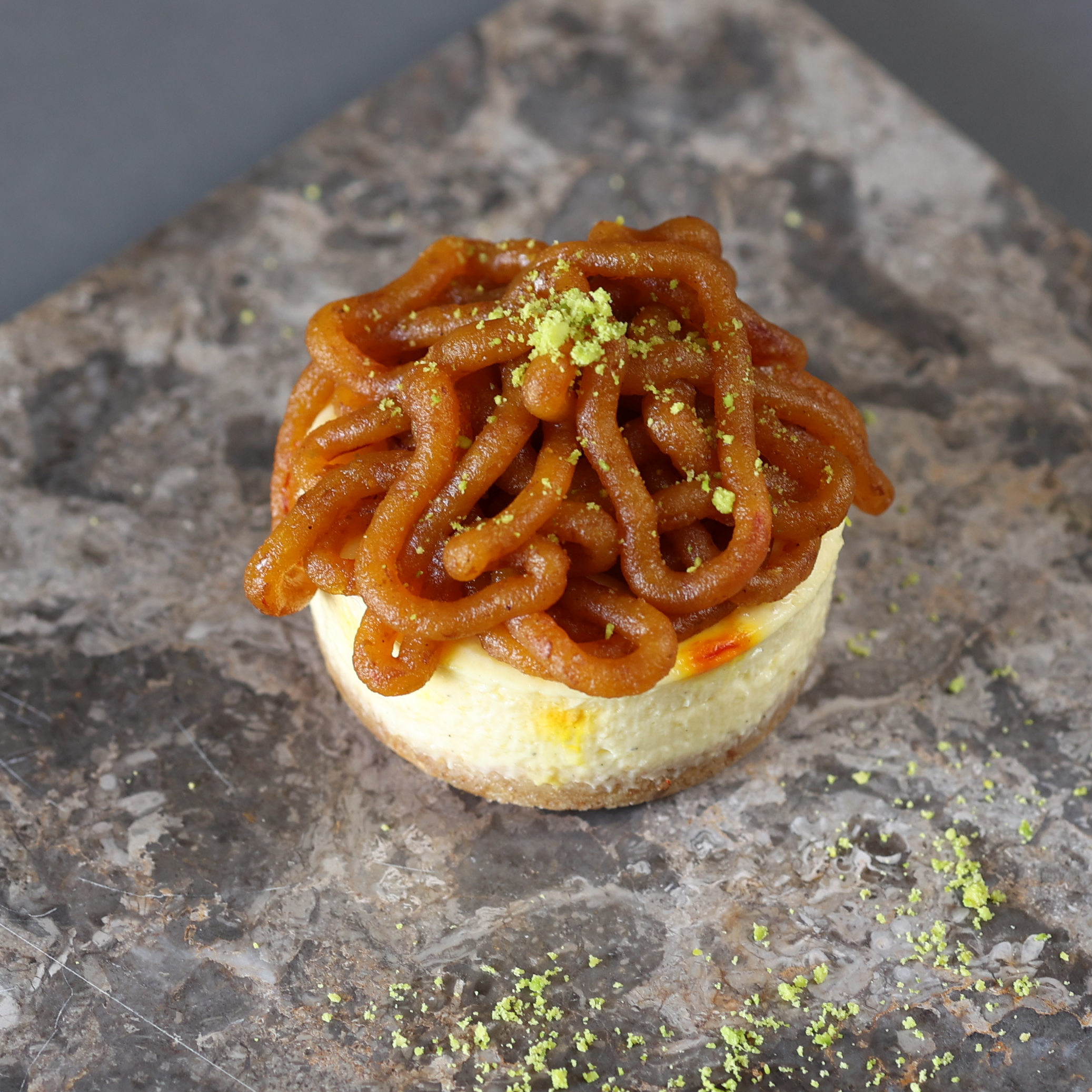 Saffron infused cheesecake, garnished with Aseeda.