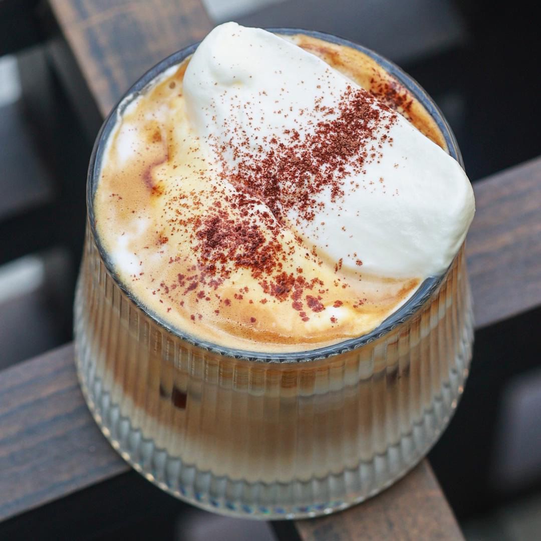Coffee ,vanilla and caramel flavor with fluffy whipped foam ,salt and Cocoa powder.